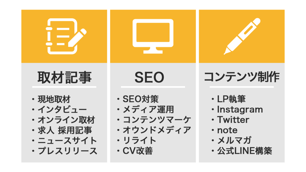 | 取材記事 | 企画立案、取材を行い記事を執筆します※別途交通費等がかかります | 10万円~ / 記事 |