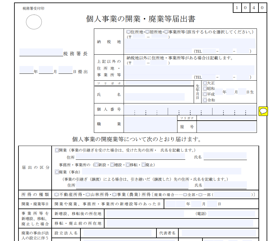 [手続名]個人事業の開業届出・廃業届出等手続|国税庁 (nta.go.jp)