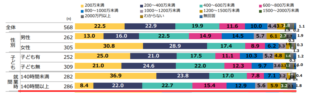 男性に比べて200万円未満の層が2倍の理由は、副業の人や家事育児の隙間時間で活動している人が多いからです。女性フリーランスの場合、20~60時間以内の短時間就業をする人が全体の68.5%を占めています。