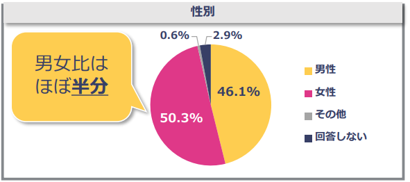 フリーランス白書2022の調査によると、フリーランスの男女比は男性が46.1%、女性が 50.3%でした。意外にも、女性の方が多い結果です。